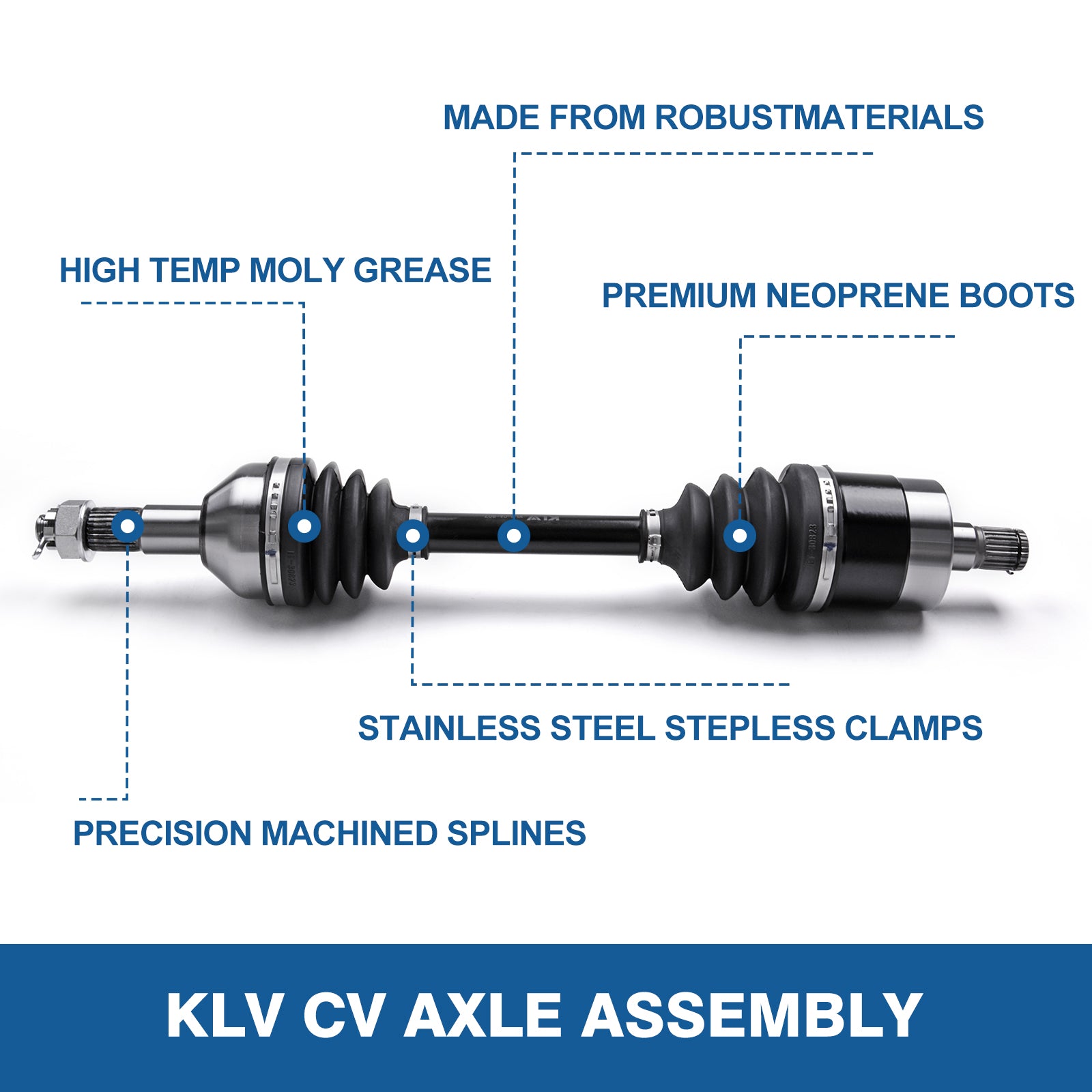 - 【Field Tested】 All KLV CV Axle Shaft Assembly components are precision machined to ensure smooth articulation and plunging to avoid friction that lead to access heat.Neoprene boots for quality protection from extreme hot or cold temperatures. Package Dimensions 24 x 4.5 x 4.5 inches