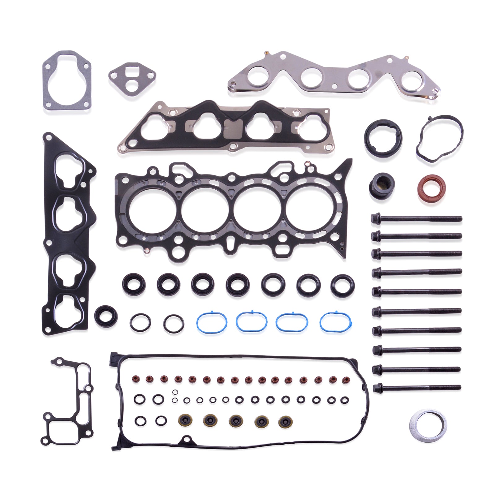 - Include: Head gasket; Intake and Exhaust manifold gasket; Valve cover gasket; Viton valve stem seals; Camshaft front seal; O-rings; Other Small Gaskets; Head Bolts