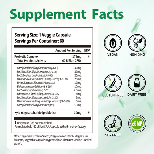 Probiotics 60 Billion CFUs, 11 Diverse Strains Natural Prebiotics for Immune, Digestive and Gut Health Supports Occasional Constipation Diarrhea Gas & Bloating for Women & Men 60 Count