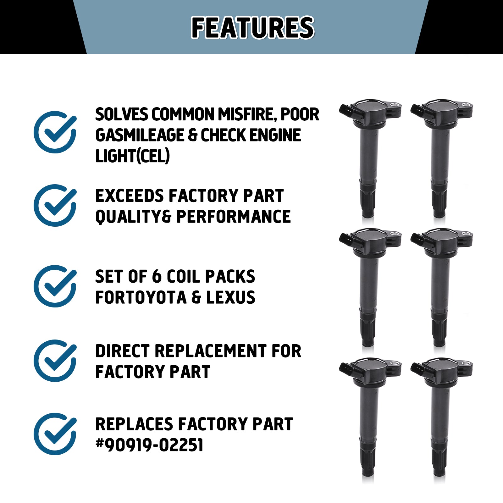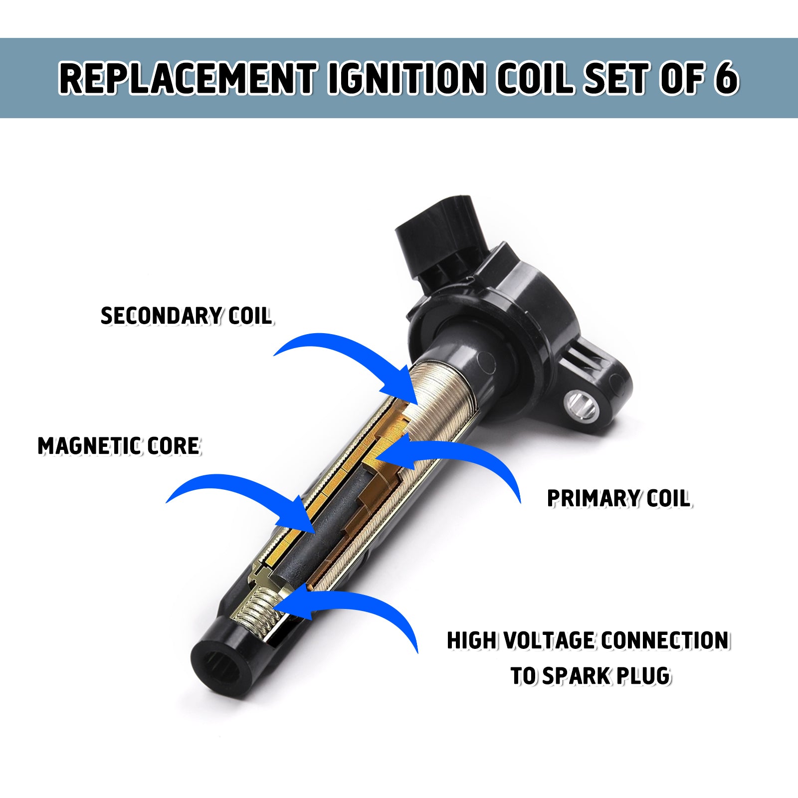 - 🚘【Replacement Ignition Coil Set of 6】:The ignition coils or ignition coil plug provides spark for your engine. Over time the factory ignition coil packs can fail leading to poor gas mileage, hesitation, and a check engine light (CEL). Replace your faulty ignition coil and restore performance and driveability on your vehicle.